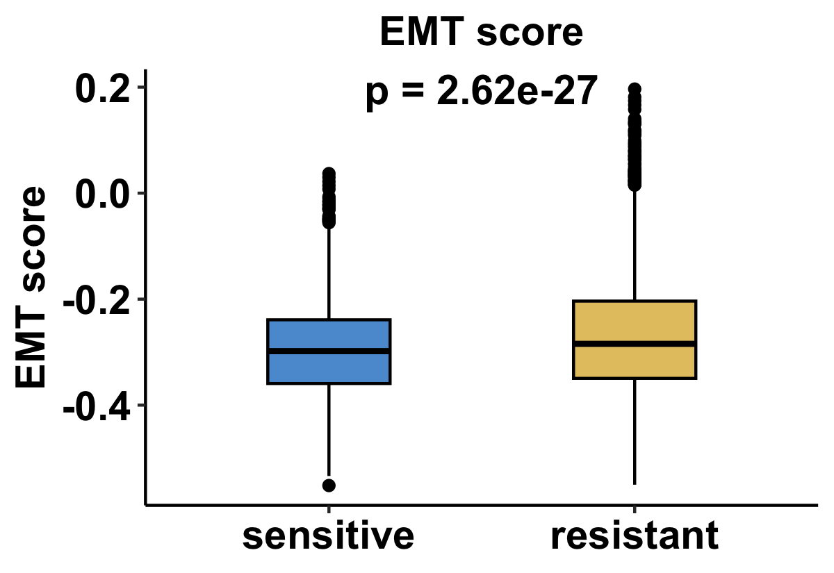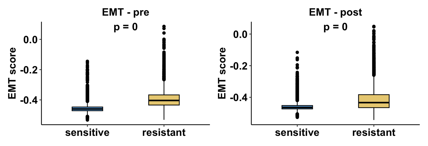 Boxplots illustrate EMT score distributions across resistant and sensitive groups. Statistical significance is evaluated using a two-sided non-parametric test. For datasets containing resistant and sensitive samples at a single treatment stage, results are shown as one comparison panel. For datasets that include both pre-treatment and post-treatment time points, comparisons are presented separately for each treatment stage, resulting in two panels to reflect stage-specific EMT dynamics. This analysis evaluates whether drug resistance is associated with enhanced mesenchymal-like phenotypes across different therapeutic contexts.