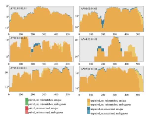 Tables summarize predicted HLA-A, HLA-B, and HLA-C alleles along with supporting read counts and confidence scores. Read depth plots illustrate alignment profiles across allele sequences, enabling evaluation of coverage distribution and genotyping robustness.