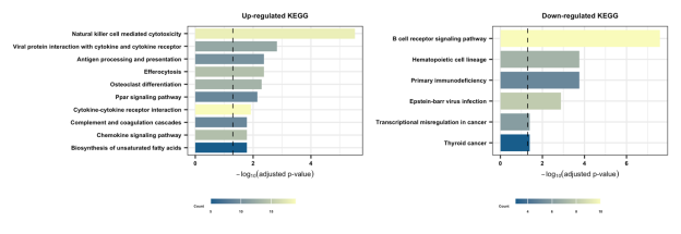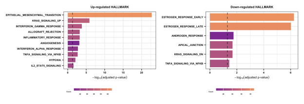Functional enrichment analysis of significantly resistance-associated genes was performed using clusterProfiler. Gene Ontology Biological Process (GO BP), KEGG pathways, and HALLMARK gene sets were evaluated. Significantly enriched pathways (adjusted p < 0.05) were visualized as bar plots, separately for upregulated and downregulated genes.