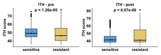 Boxplots illustrate the distribution of ITH scores across response groups. Statistical comparisons are performed using a two-sided non-parametric test. For datasets containing both resistant and sensitive samples at a single treatment stage, results are shown as one comparison panel. For datasets that include both pre-treatment and post-treatment time points, comparisons are presented separately for each treatment stage, resulting in two panels to reflect stage-specific heterogeneity changes. These results provide insight into whether resistance is associated with increased or decreased cellular heterogeneity.