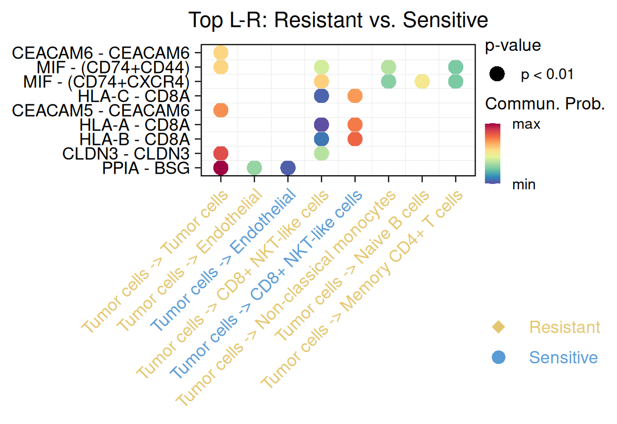 Differential ligand–receptor interactions between resistant and sensitive groups were identified by comparing communication probabilities across conditions.