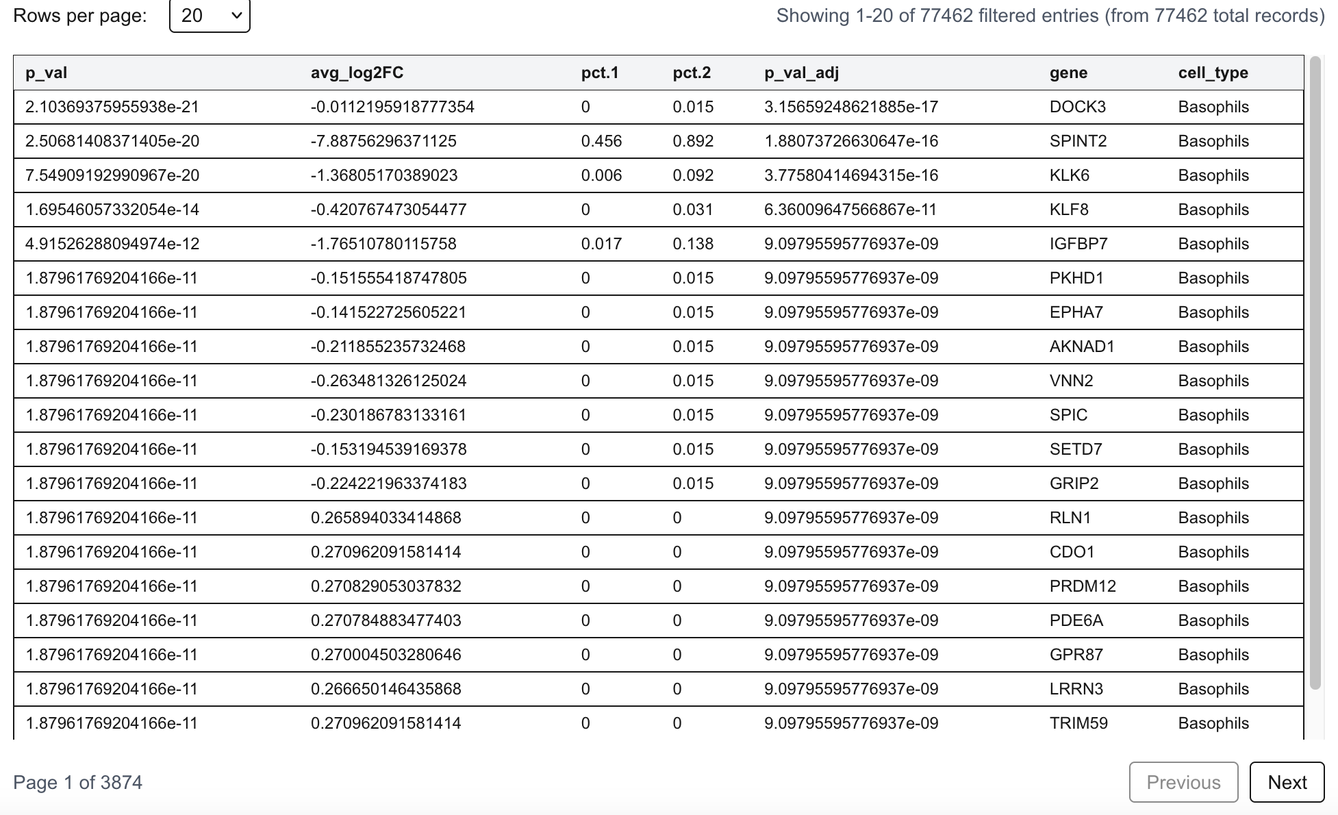 The table displays genes meeting the predefined significance criteria, including an adjusted p-value < 0.05 and an absolute average log2 fold change (|avg_log2FC|) > 0.5. These genes represent significantly regulated alternative polyadenylation events associated with drug response. The complete list of tested genes is available in the Download section.