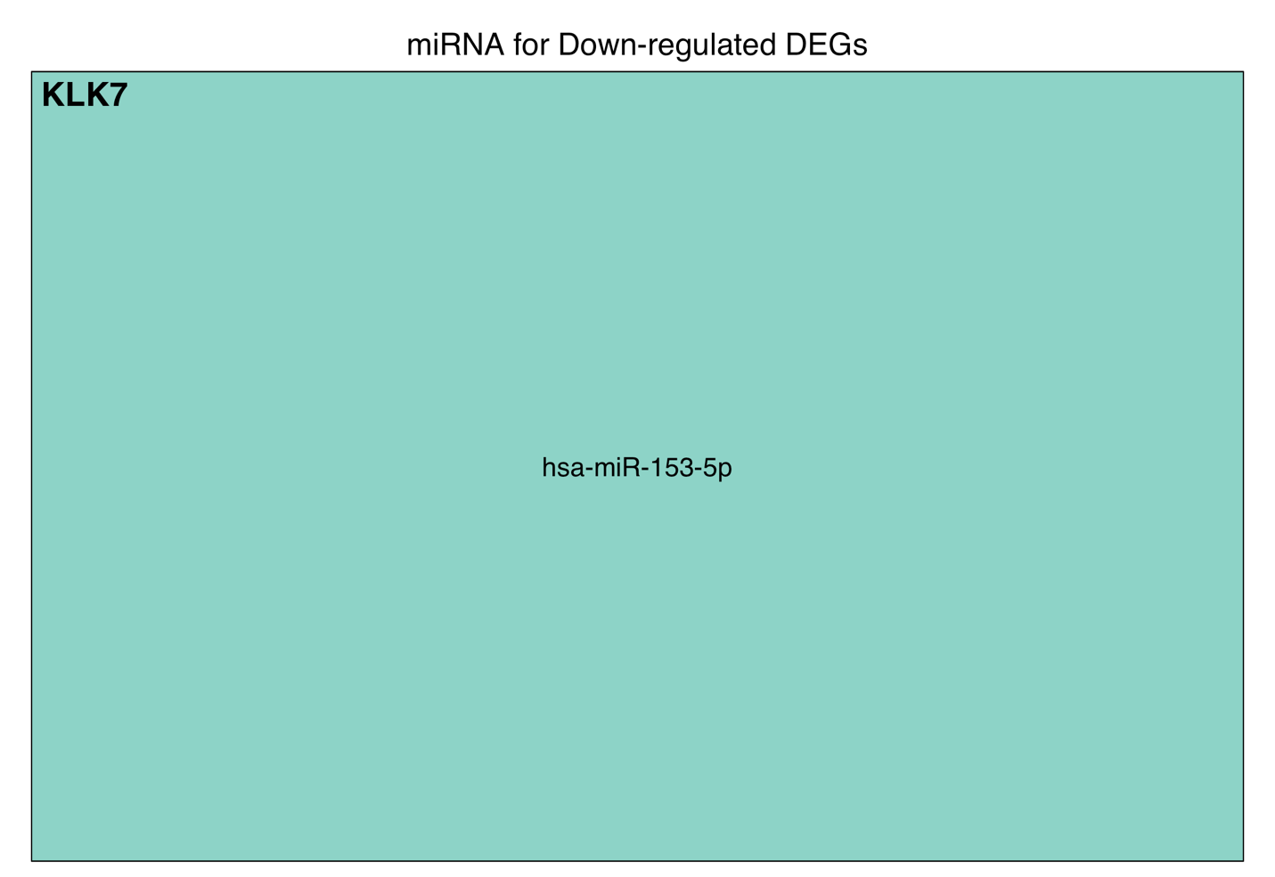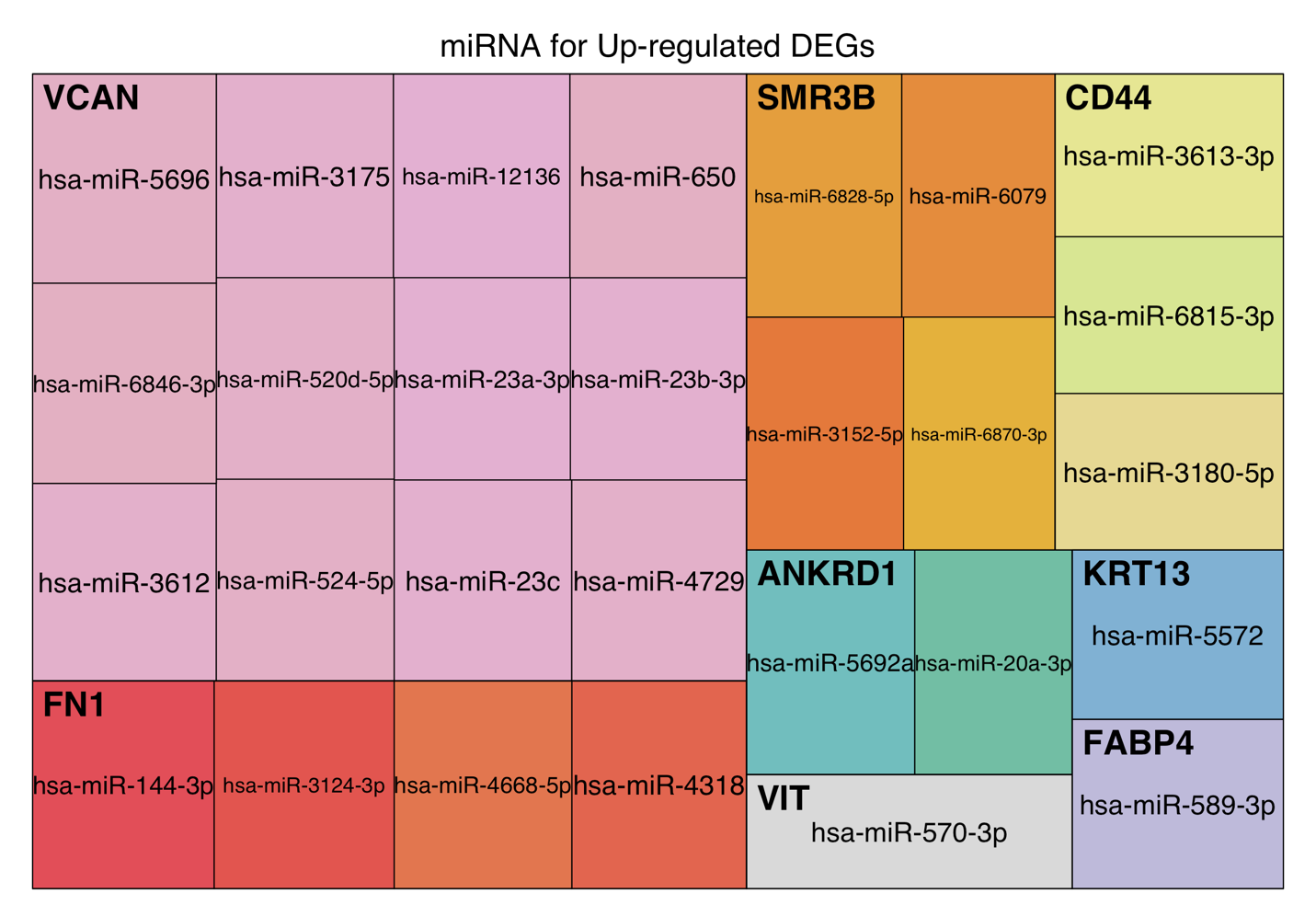 Treemaps visualize predicted miRNAs regulating upregulated and downregulated DEGs separately. Block size corresponds to regulatory confidence score. Only high-confidence interactions are shown. Complete miRNA-gene association tables are available for download.