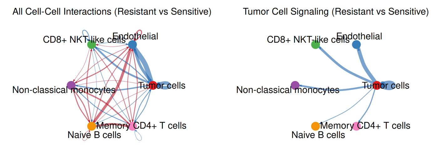 By focusing on condition-specific changes rather than absolute interaction strength, this analysis highlights signaling axes that may contribute to drug resistance-associated microenvironment remodeling. These results complement the global interaction networks by pinpointing specific ligand-receptor pairs enriched in either resistant or sensitive contexts, facilitating mechanistic interpretation of response-associated communication shifts.