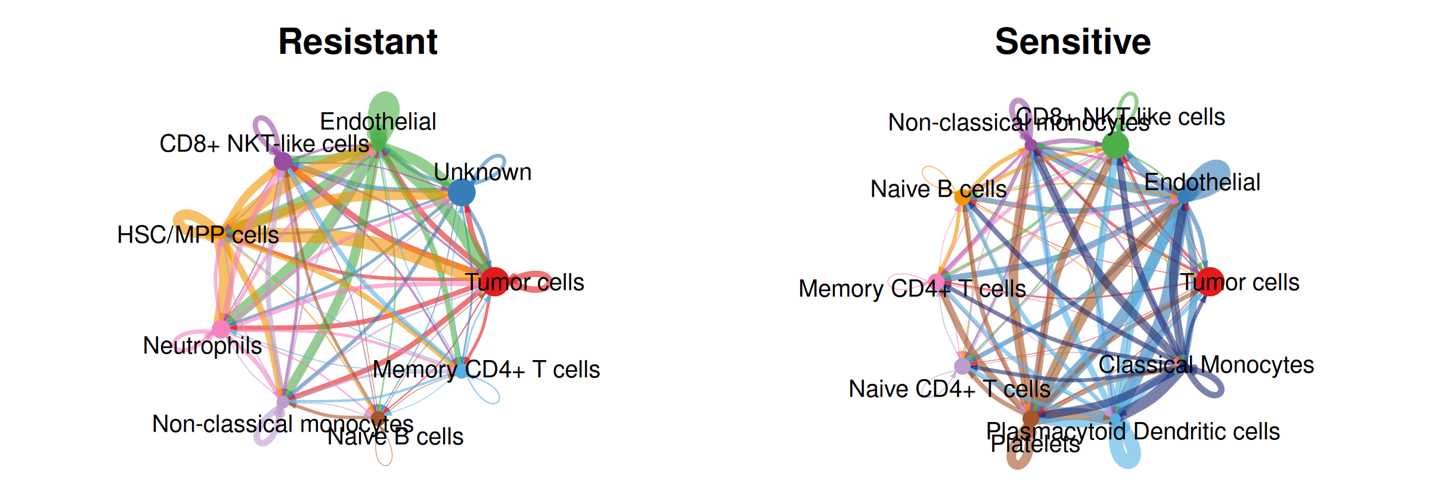 This module presents inferred ligand–receptor–mediated communication networks separately for resistant and sensitive groups. Interaction inference is performed using curated ligand–receptor databases combined with statistical testing to identify significant signaling events between annotated cell types. Communication probability is estimated based on aggregated ligand and receptor expression across cell populations, allowing construction of condition-specific signaling networks.
