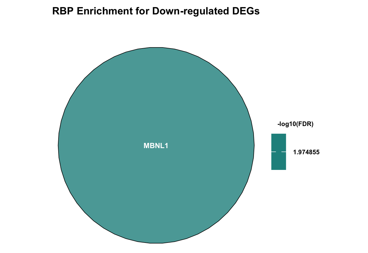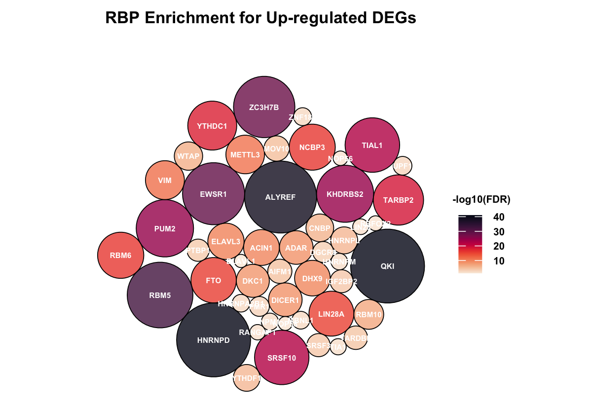 RBP enrichment analysis was performed using hypergeometric testing based on ENCORI/starBase target gene collections. Significantly enriched RBPs (FDR < 0.05) were visualized using circle packing plots.