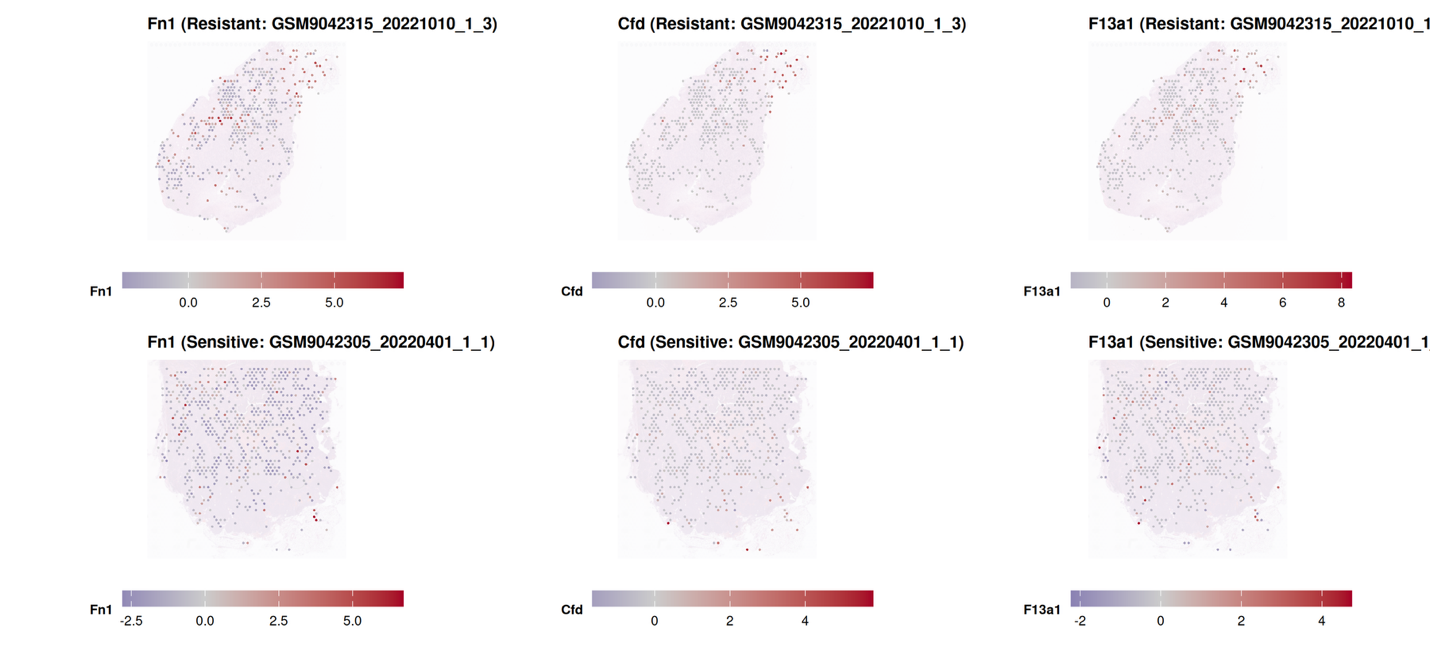 Spatial clustering and differential expression analyses were performed to identify region-specific gene expression patterns. Drug response–associated genes were evaluated within spatial contexts by comparing resistant and sensitive samples separately.