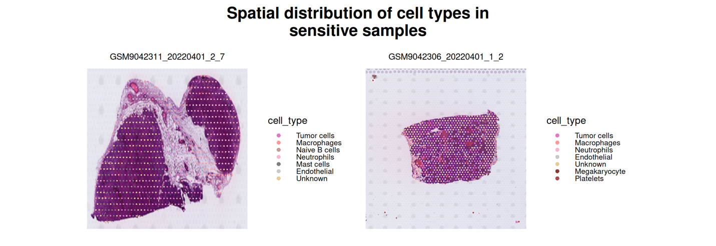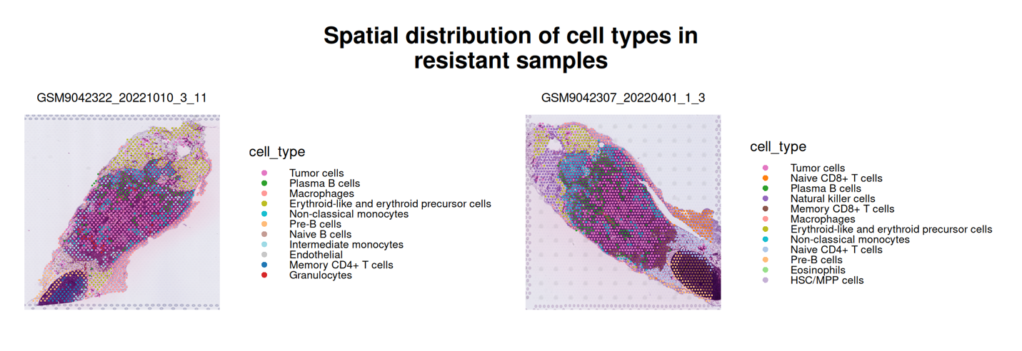 By comparing resistant and sensitive samples, users can examine how tumor cells and non-malignant populations (e.g., immune or stromal compartments) are distributed within the tissue architecture. This spatial view allows assessment of microenvironmental organization and potential structural differences associated with therapeutic response.