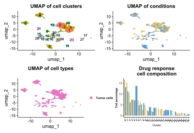 This section visualizes the cellular composition and response distribution within the dataset. Single-cell clustering is performed using a standardized Seurat workflow, and UMAP embeddings display cells colored by Seurat clusters, annotated cell types, and drug response status (resistant versus sensitive). This enables rapid assessment of cell-type heterogeneity and treatment-associated cellular shifts.